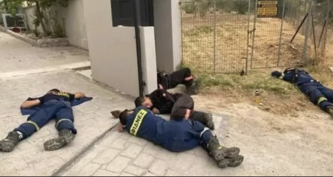 Mediat në vend kanë publikuar një foto në të cilën shfaqen disa zjarrfikës vullnetarë duke pushuar, të shtrirë në tokë, pasi kanë luftuar me orë të zgjatura me flakët.