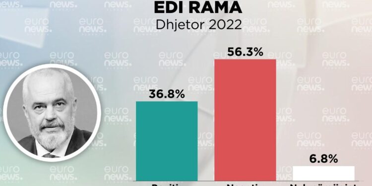 56.3% e shqiptarëve kanë mendim negativ për kryeministrin Edi Rama. Ndërsa 36.8% kanë mendim pozitiv dhe 6.8% nuk përgjigjen.