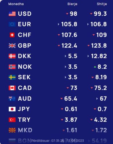 Monedha evropiane euro do blihet me 105.8 lekë dhe do shitet me 106.8 lekë, ndërsa franga zvicerane do blihet me 107.6 lekë dhe do shitet me 109 lekë.Ndërkohë paundi britanik do blihet me 122.4 lekë dhe do shitet me 123.8 lekë.