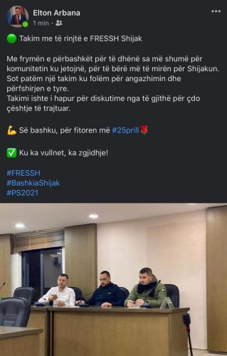 Mbrëmjen e sotme kryetari i bashkisë së Shijakut z.Elton Arbana ka realizuar një takim me të rinjtë e qytetit të tij. Qëllimi i takimit ka qenë koordinim dhe mbështetje për të rinjtë dhe diskutim për të ecur para drejt 25 prillit.