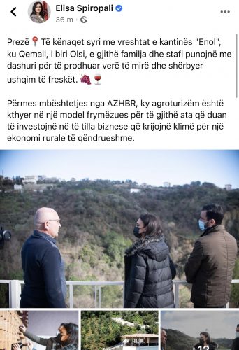 Gjatë vizitës në Prezë ministrja Spiropali dhe Gentian Picari vizituan edhe kantinën e verës Enol. Çdo ditë të angazhuar në njohjen dhe promovimin e Vorës dhe fshatrave të saj.
