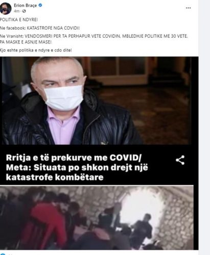 Nisur nga alarmi që ngriti Presidenti Meta se vendi po shkon në katastrofë nga COVIDI, Braçe i ka publikuar një foto nga një mbledhje e organizuar në Vranisht, ku merrnin pjesë rreth 30 vetë dhe pa asnjë masë.