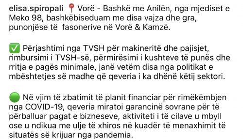 Ministrja Spiropali ditën e sotme ka realizuar një bisedë fizikisht dhe nëpërmjet zoomit me punonjëse të fasonerive në Vorë dhe Kamëz. Gjatë takimit diskutuan për kushtet të cilat lehtësojnë punën e tyre dhe mundësi më shumë.