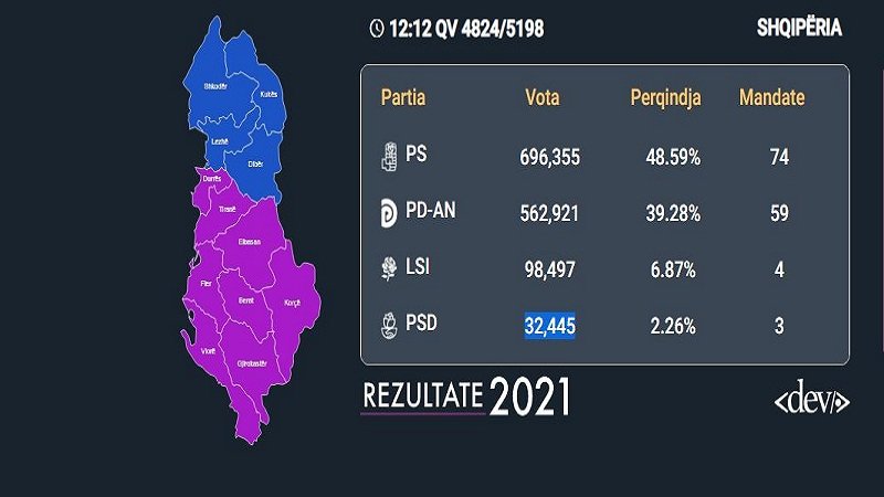 PS ka 74 mandate, ndërsa PD 59 mandate, LSI 4 dhe PSD 3 mandate. Nga 5198 qendra votimi deri më tani janë numëruar 4824.